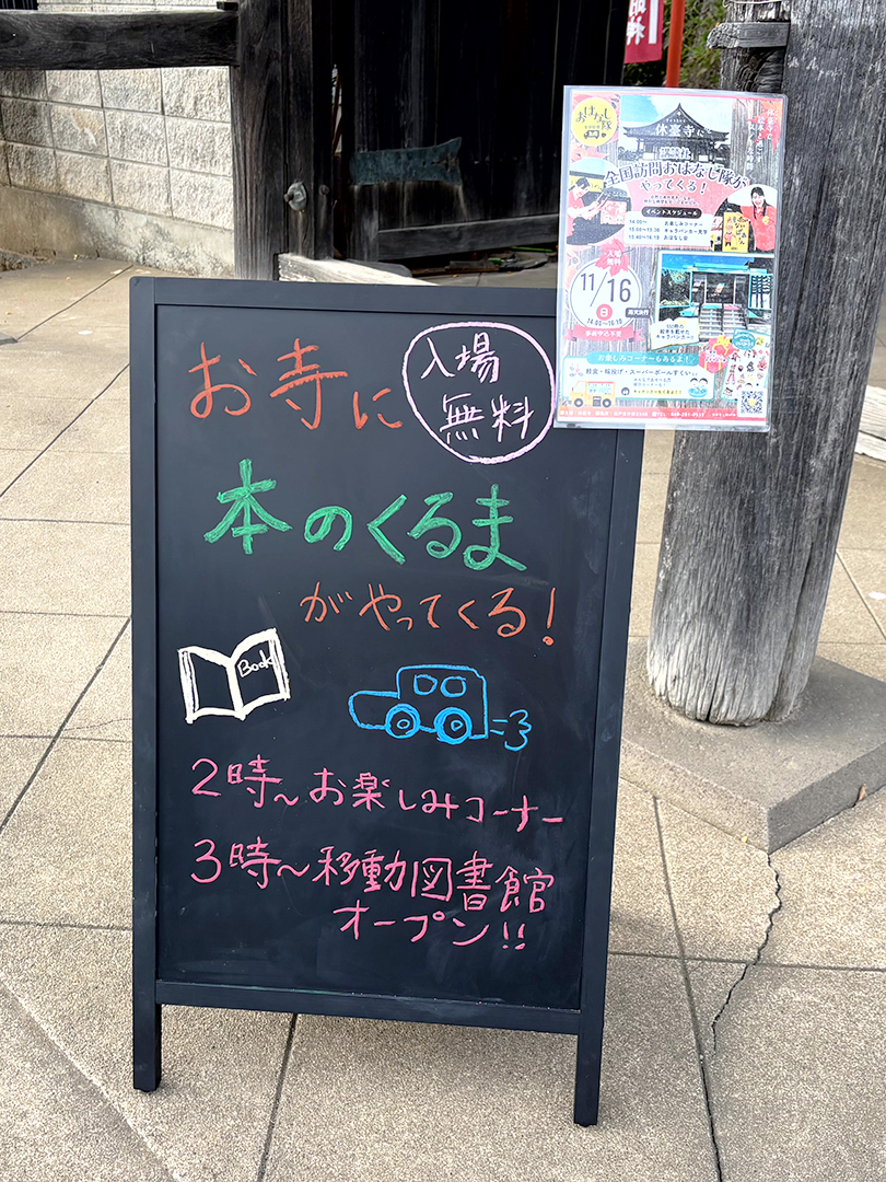 お寺の入口には「お寺に 本のくるま がやってくる!」と書かれた、温かい手書きの看板が私たちを迎えてくれました。