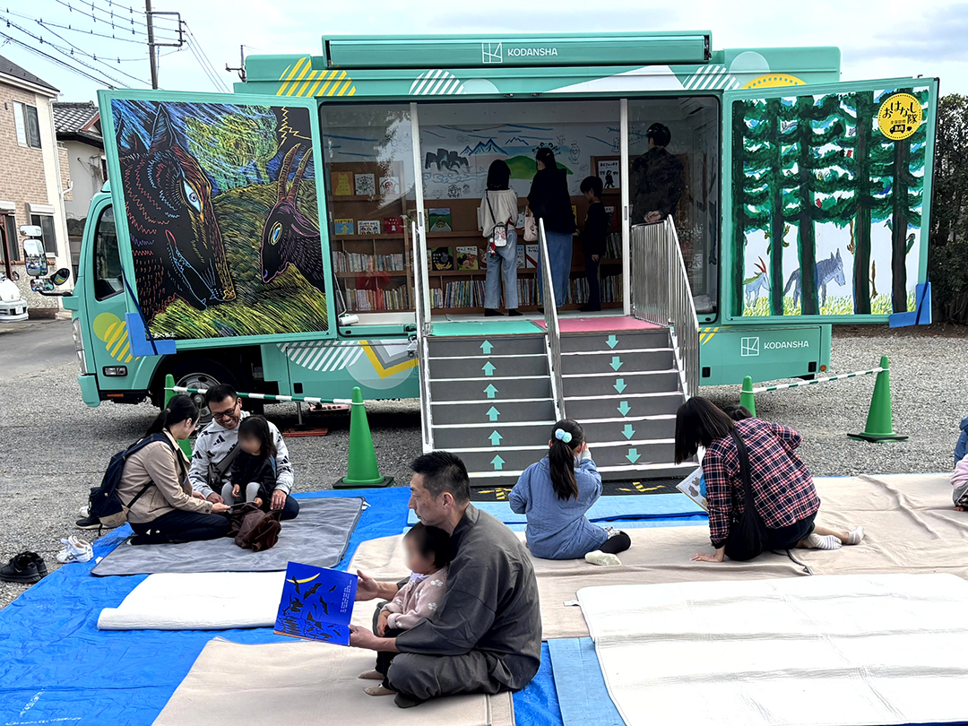 おはなし会の後も、キャラバンカー緑号の周りに敷かれた青いシートの上で、親子が思い思いに絵本を広げる姿が印象的でした。