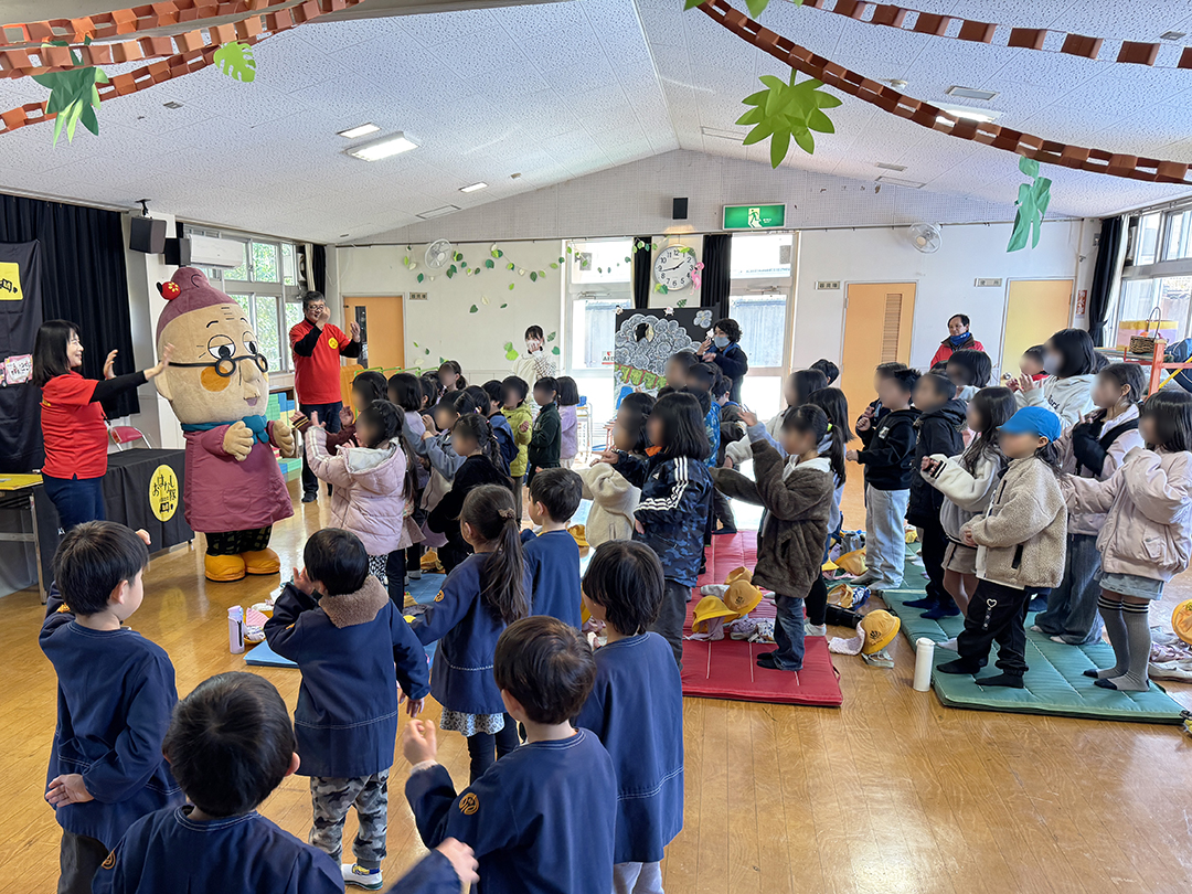 会場が温まったところで、スペシャルゲストの「もったいないばあさん」が登場!これには子どもたちも大興奮です。最後はみんなで輪になり、おばあさんと一緒に「もったいないばあさん音頭」を踊りました。寒さを吹き飛ばすほどの熱気がホールいっぱいに広がりました。