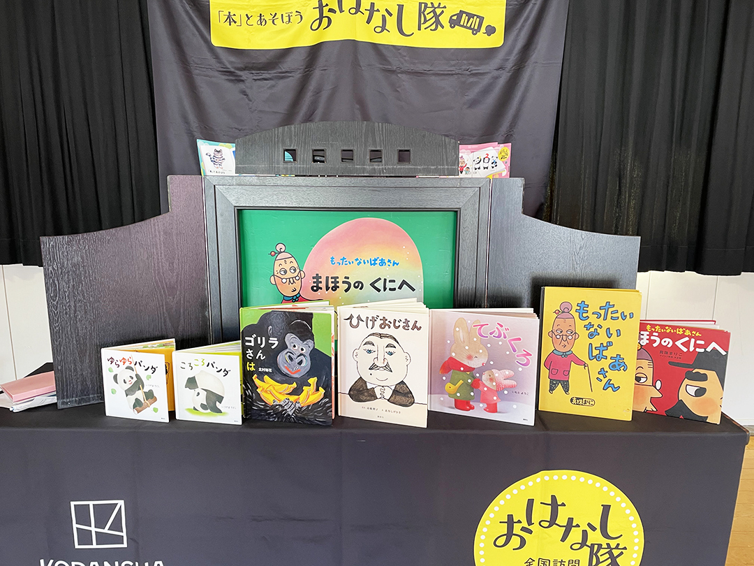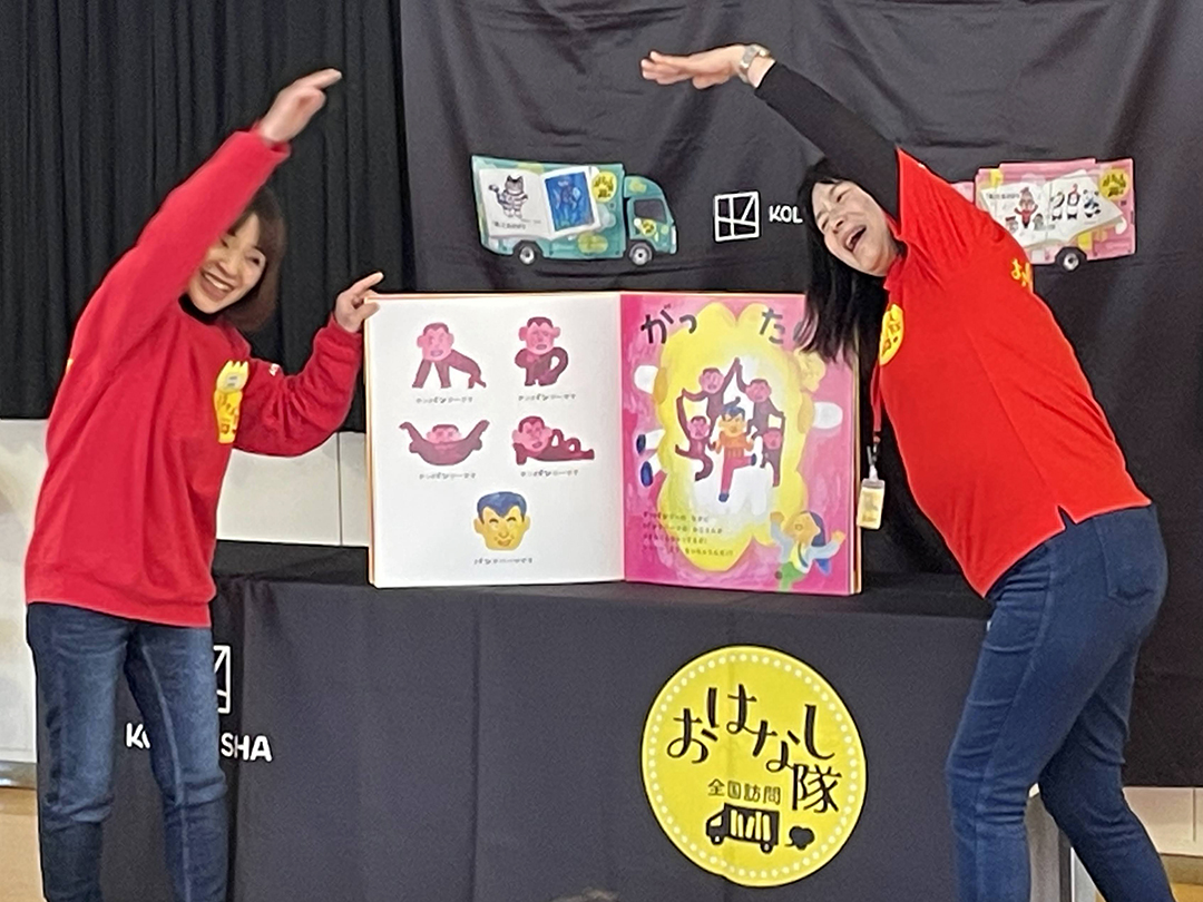 読み聞かせのトップバッターは、2人の隊長が一緒に読む『ゆらゆらパンダ』と『ころころパンダ』です。息の合った掛け合いにみんな釘付け。そして、最後に裏表紙の絵がつながる仕掛けをお見せすると、子どもたちだけでなく、見ていた先生方からも「オーッ!」と驚きの歓声が上がりました。